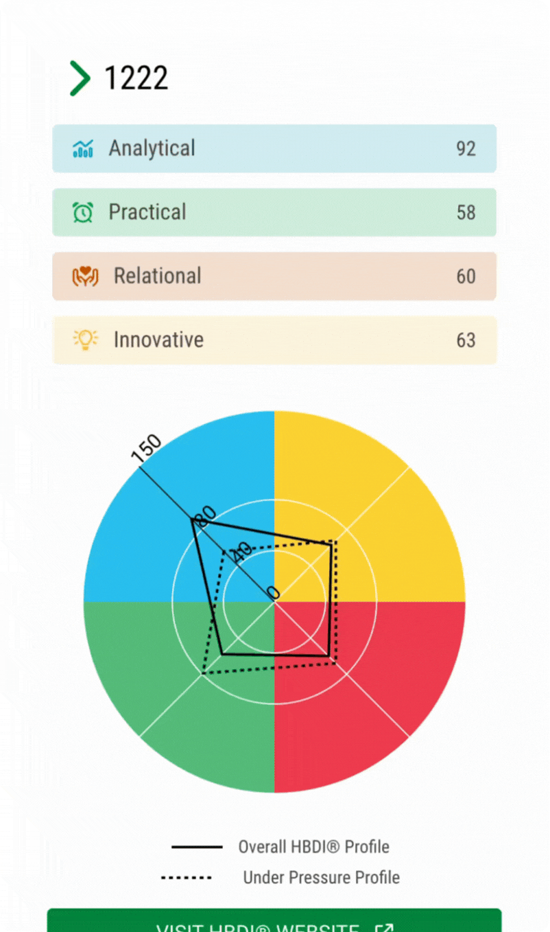 - Official, science-backed HBDI® assessment — based on Ned Herrmann’s four-quadrant model of thinking preferences.