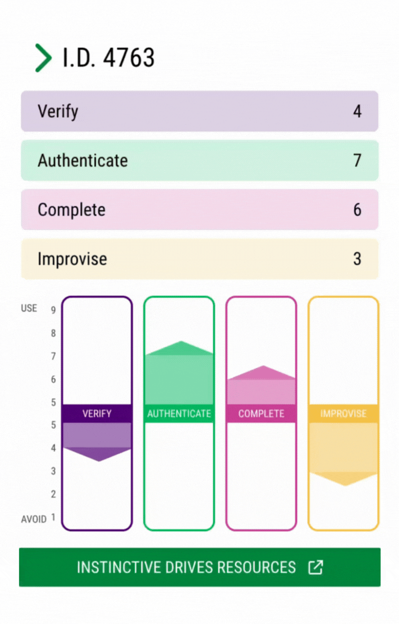 I.D.™ identifies four core Instinctive Drives, innate motivations that shape how people naturally get work done. Each person’s result is a four‑digit code that shows their unique combination and intensity across the drives.