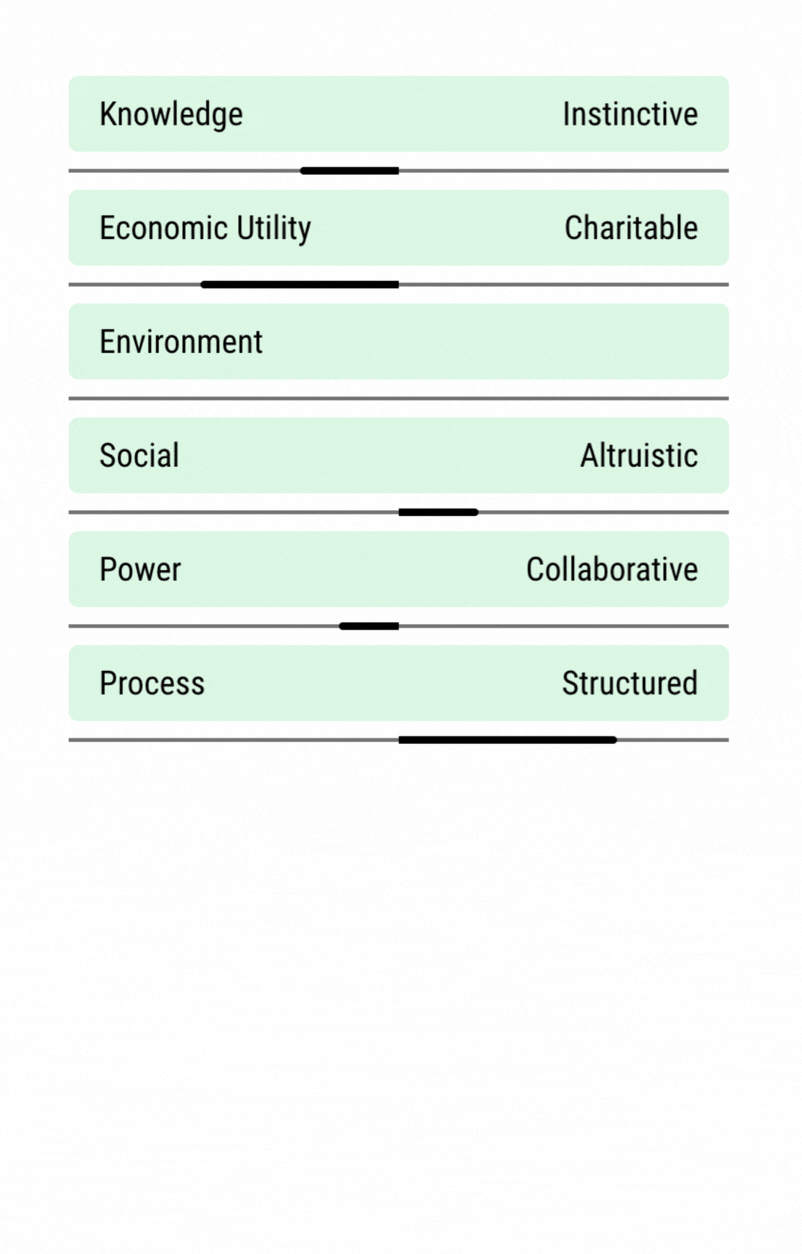 - Six value lenses — Knowledge, Economic Utility, Environment, Social, Power, Process.