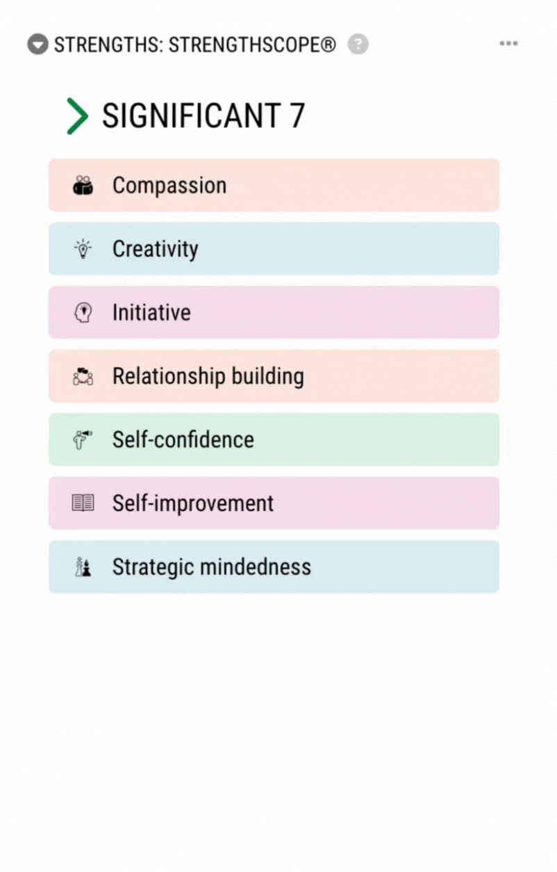 A strengths assessment that identifies the qualities that energize you, highlights your Significant 7, and flags overdrive risks so you can perform at your best consistently.