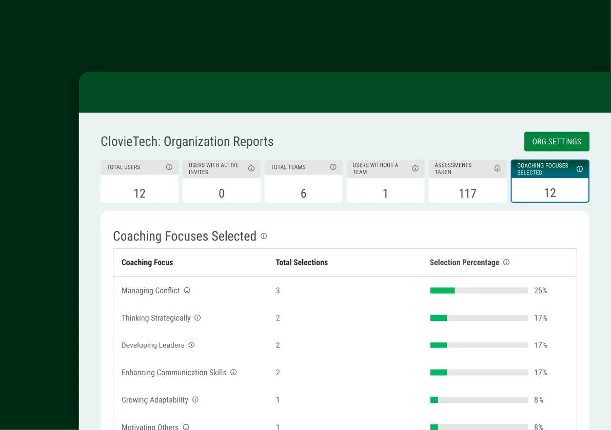 Track coaching activity, assessment usage, and engagement trends by team, manager, or role—so that you can show ROI, not just hope for it.