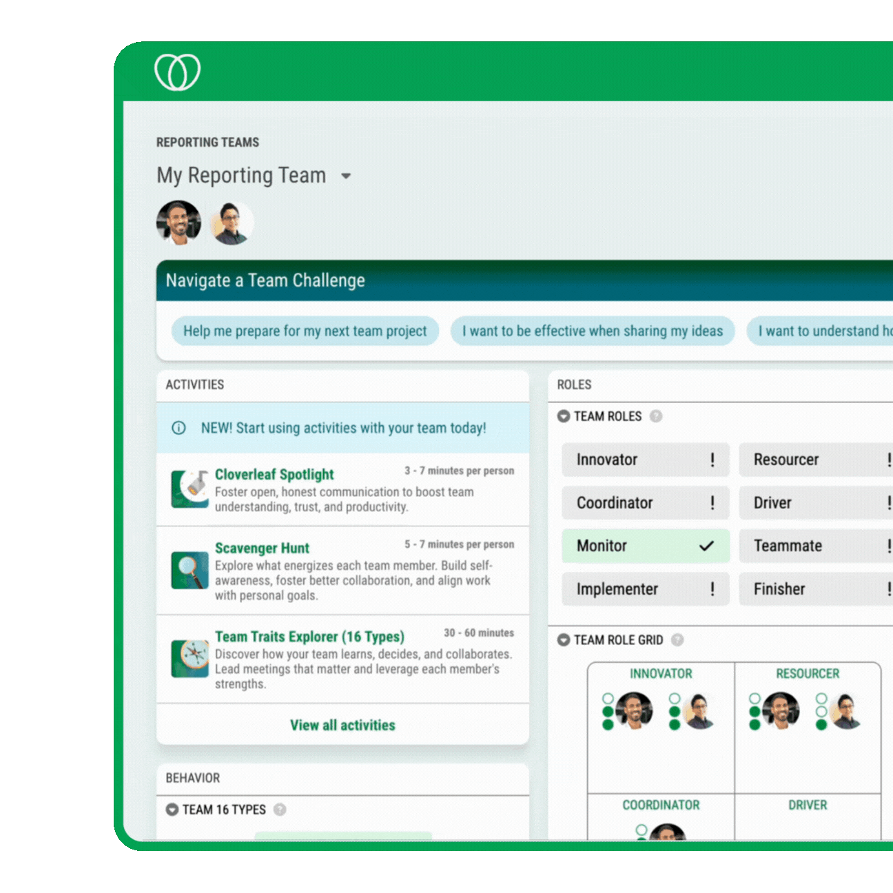 Cloverleaf supports 12+ assessments—including DISC, Enneagram, CliftonStrengths®, and more—and makes the results actionable inside daily workflows. See all Cloverleaf assessments.